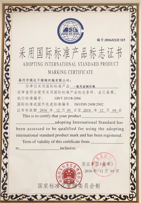 泰州市強達不銹鋼絲繩有限公司位于江蘇興化市戴南經濟開發區,公司致力于不銹鋼絲繩產品生產,立志成為“國內技術標桿型吊索具生產企業”。以此戰略思想指導,公司堅決貫徹“質量贏市場,管理增效益,誠信贏天下”的質量方針。以完善的服務在國內不銹鋼絲繩市場樹立良好的品牌形象。公司榮獲“江蘇省質量信得過企業。     靈活的管理機制,經驗豐富的